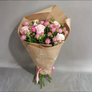 Букет сочетает в себе прекрасное соединение кустовых пионовидных роз и одноголовых роз, создавая уникальную композицию. Яркие и нежные лепестки пионовидных роз добавляют роскоши, раскрывая душу букета, тогда как нежные розы придают нотки изящества и элегантности. Каждый цветок обладает своим уникальным шармом, воплощая моменты радости и любви в этом прекрасном букете, который навсегда останется в сердце получателя.
